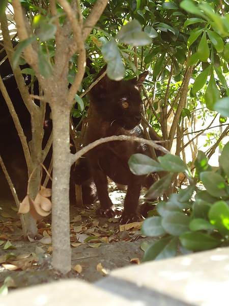 野貓一家人住在花圃裡,小黑貓最呆,一直跑來跑去,其它貓則都老神在在
